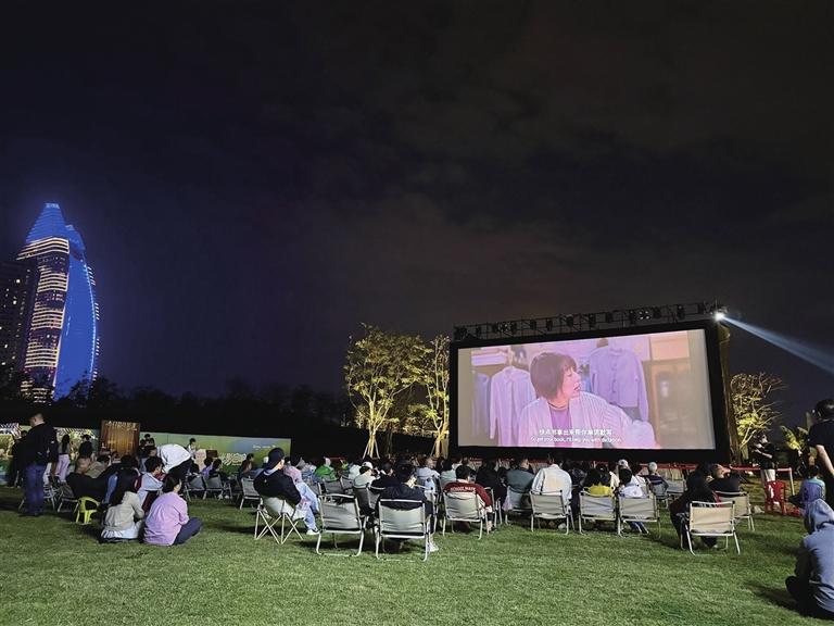 当晚7点半的海棠河生态公园,电影《爱情神话》的画面在银幕上缓缓铺展,草坪上早已座无虚席。市民游客或带着家人、或约上好友,三五成群围坐,时而轻声交流剧情,时而沉浸在光影构筑的温情故事里。“三亚气候宜人、生态优良,这场椰风下的露天电影对外开放还免费,体现着这座城市的开放与热情,这是属于三亚的浪漫。”来自河北的电影“发烧友”李筱说。