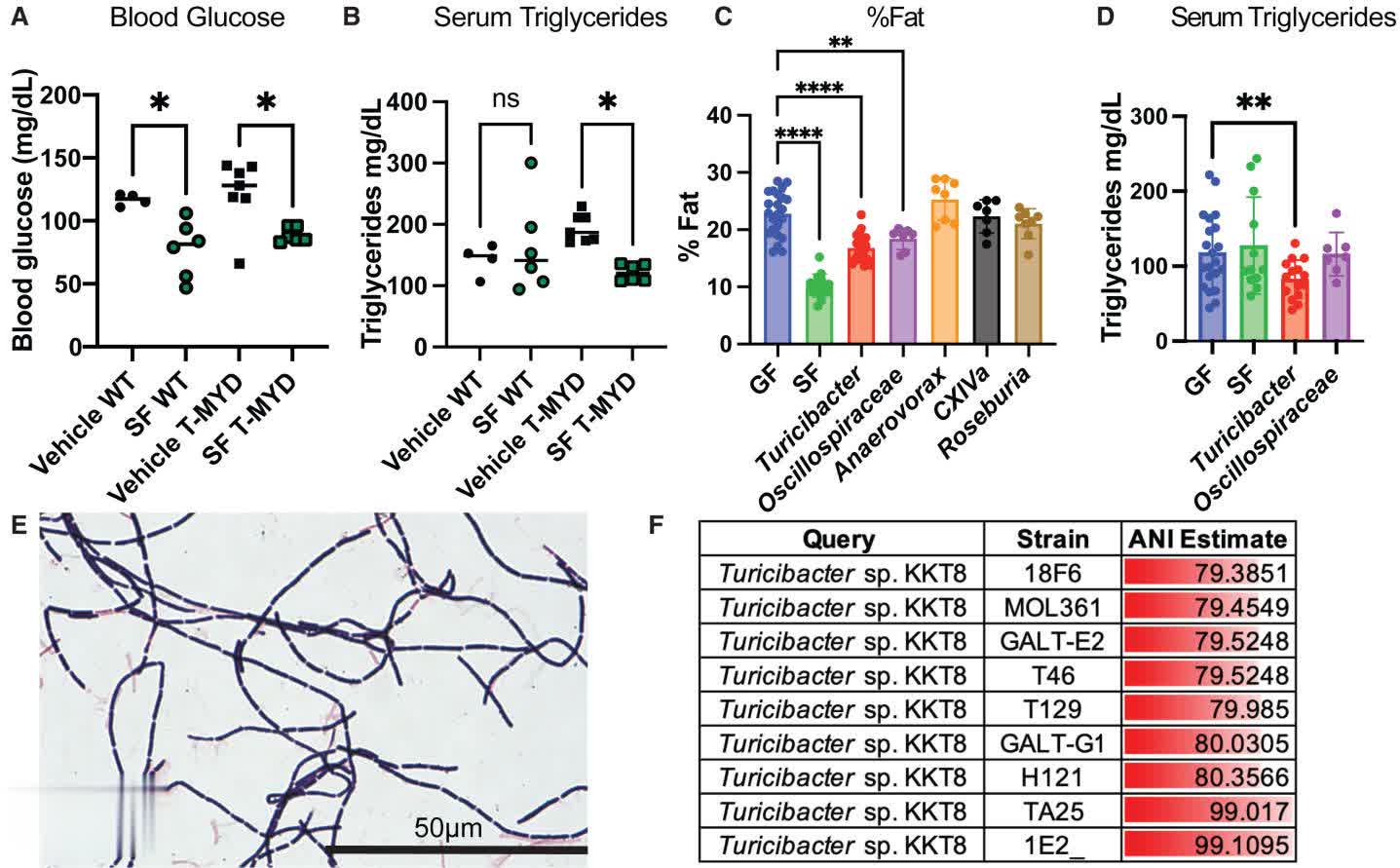 鉴定来自SF群落的瘦身诱导微生物(A和B)(A)8周龄雄性WT和T-MyD88小鼠的空腹血糖和(B)血清甘油三酯在补充SF的HFD上2个月(WT,n = 10;T-Myd88,n = 13)。图片来源:细胞代谢 (2025)。