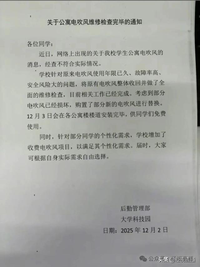 12月5日,记者联系上一位中北大学在读的学生。该学生介绍,宿舍吹风机收费标准分为三分钟0.5元、五分钟0.8元两种。同时,该同学还提供了一张宿舍楼内张贴的《关于公寓电吹风维修检查完毕的通知》照片。这份由学校后勤管理部与大学科技园于12月2日发布的通知提到:学校针对原来电吹风使用年限已久,故障率高、安全风险大的问题,将原有电吹风整体回收做全面的维修检查,目前相关工作已经完成,替换了部分损坏的电吹风并重新安装,供免费使用。同时,针对部分学生的个性化需求,学校增加了收费电吹风项目。