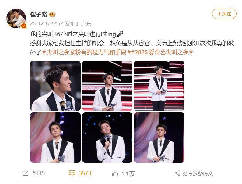 然而,热闹背后也有“硬伤”。翟子路虽是中央戏剧学院播音主持专业科班出身,但首次挑战大型盛典主持,显然压力山大。他需要同时完成现场控场、宣传新剧《北上》、为综艺造势以及配合高频微博互动(17 小时内连发 5 条动态)等多重任务。他自承的“紧紧张张”状态在台上暴露无遗,除了这次标志性口误,现场还出现了多次嘴瓢。