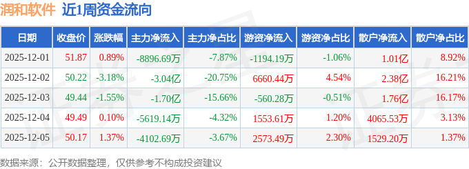 本周盘点(12.1-12.5):润和软件周跌2.41%,主力资金合计净流出6.61亿元