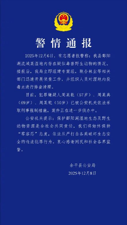 【警方通报3人疑在鄱阳湖毒害候鸟】3人疑在鄱阳湖湿地投毒被抓 12月8日,江西省余干县公安局发布警情通报: 2025年12月6日,有志愿者报警称:我县鄱阳湖流域某湿地内存在疑似毒害野生动物的情况。接报后,我局立即
