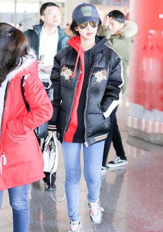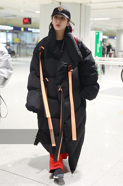 内搭她选了基础款黑色连帽卫衣,把羽绒服敞开穿,看起来更有层次感。下装是百搭的黑色紧身裤,顺着腿部线条延伸到白色厚底鞋,松紧之间把过膝长羽绒服的压个子风险彻底化解。再配上白色的棒球帽和黑色墨镜,整个人散发着一种温柔清透又时髦的气息。她手提一个小巧的手提包,优雅地走在机场,仿佛是一位从童话中走出来的公主。