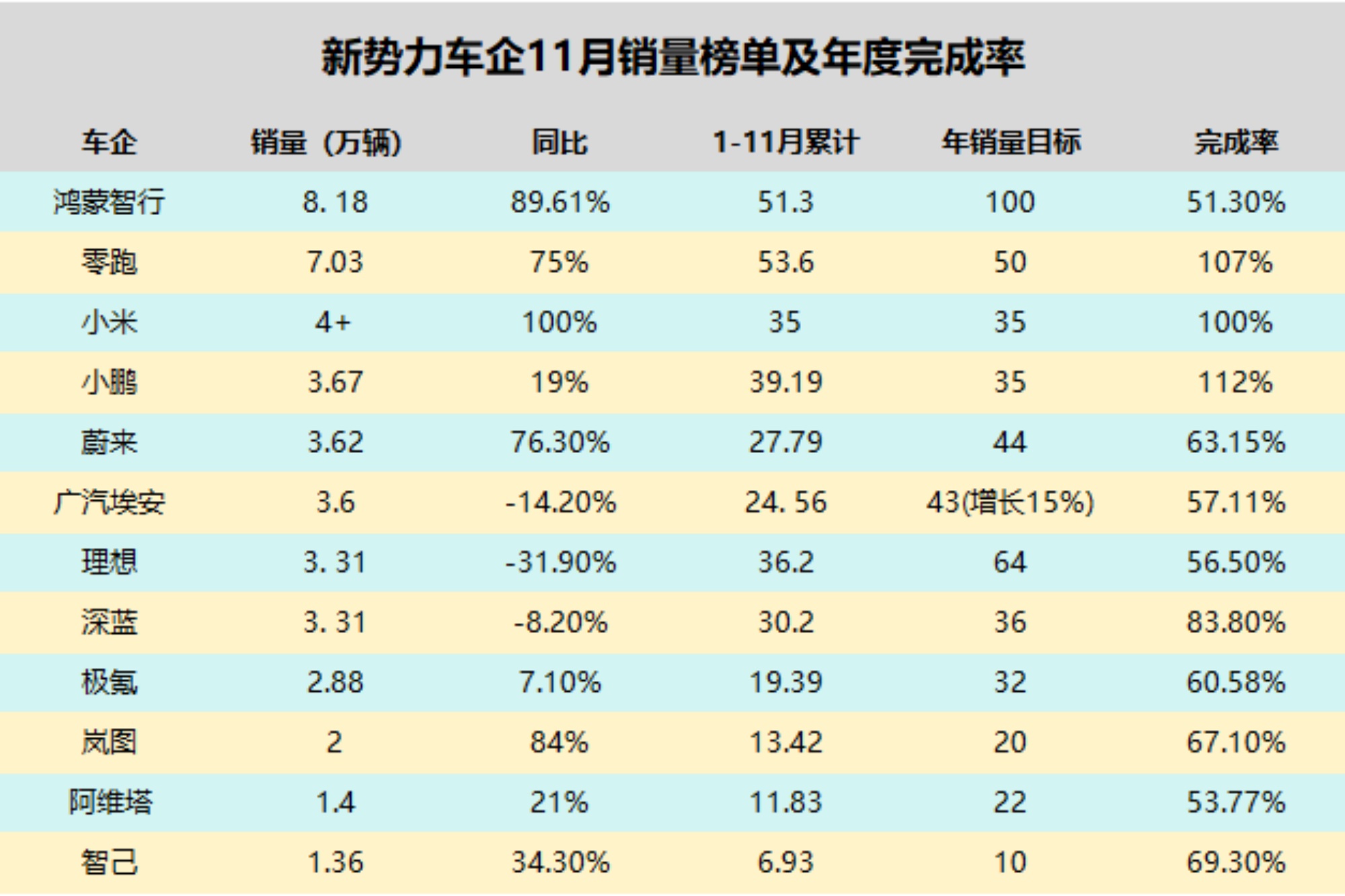 最戏剧化的当属鸿蒙智行。11月8.18万辆月销、51.3万辆累计销量稳居榜首,全系均价39万、月销8万+的战绩让同行眼红。但年度目标完成率仅51.3%,若按全年100万辆目标推算,12月需狂卖49万辆,这几乎是天方夜谭。业内猜测,鸿蒙智行或调整战略重心,从“冲量”转向“提质”,通过五界车型矩阵深化全场景覆盖。毕竟,生态协同效应才是长期王道。