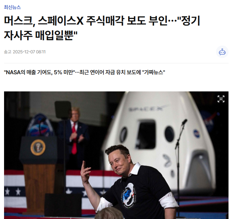 据韩联社最新消息显示,马斯克否认SpaceX正以8000亿美元估值融资,但未回应关于该公司计划出售内部股份的报道。