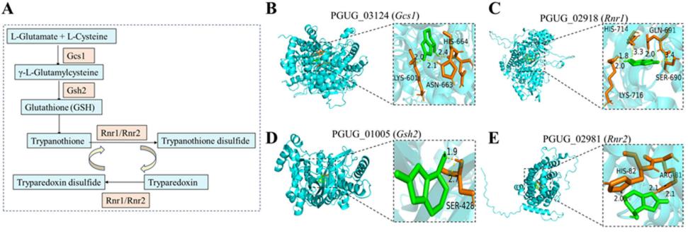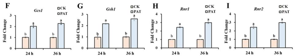 在谷胱甘肽代谢途径中,编码谷氨酸-半胱氨酸连接酶催化亚基的Gcs1、编码谷胱甘肽合成酶的Gsh2、编码核糖核苷-二磷酸还原酶亚基M1和M2的Rnr1和Rnr2四个基因显著上调(图2A)。 通过分子对接模拟了上述四种蛋白与PAT的结合。 如图2B-E所示,与GSH代谢途径相关的酶可以与PAT形成氢键,这些氢键的长度从1.8到3.4 Å不等。 此外,RT-qPCR分析显示,这四个基因的表达水平显著升高。 (图2 f i)。