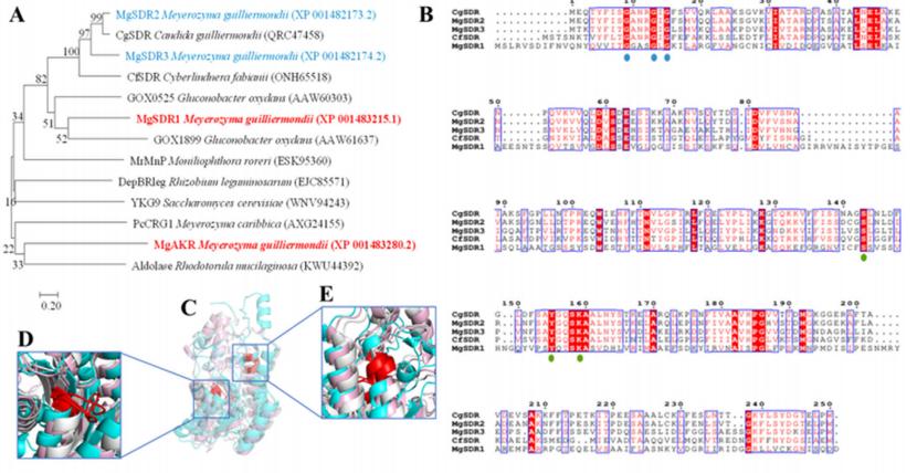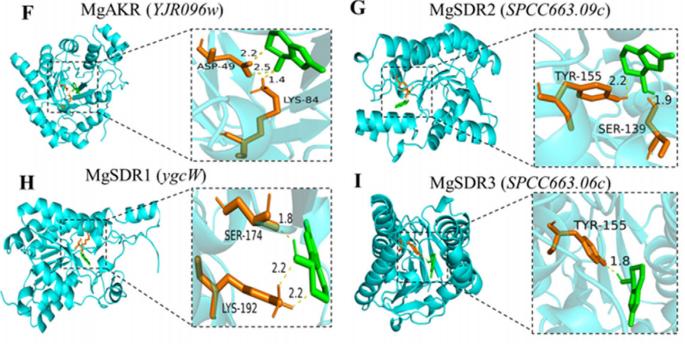分子对接用于从DEGs中筛选具有催化和氧化还原活性的能够与PAT结合的蛋白质。 结合相关文献,共筛选出4种潜在降解酶,其编码基因均显著上调。 在潜在降解酶中,4个基因显著上调; YJR096 W编码醛酮还原酶(MgAKR), ygcW、SPCC663.09c和SPCC663.06c编码MgSDR1、MgSDR2和MgSDR3, respectively。 对这四种降解酶和文献中报道的降解酶进行系统发育树分析发现,MgAKR和MgSDR1与之前报道的降解酶具有较低的相似性,表明它们具有潜在的新颖性(图3A)。 mgakr的功能在以前的研究中已经有报道。 因此,作者的主要重点是研究MgSDR1的功能。 MgSDR1可以与SDRs家族的辅因子结合位点(GXXXGXG)和活性位点(YXXXK)对齐(图3B-E)。 如图3f - 1所示,潜在的降解酶可以通过氢键与PAT结合,这些氢键的长度从1.8到2.5 Å不等。 RT-qPCR分析显示,这四个基因的表达水平均显著升高(图3J-M)。