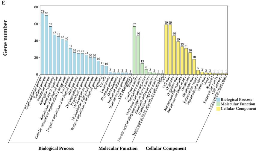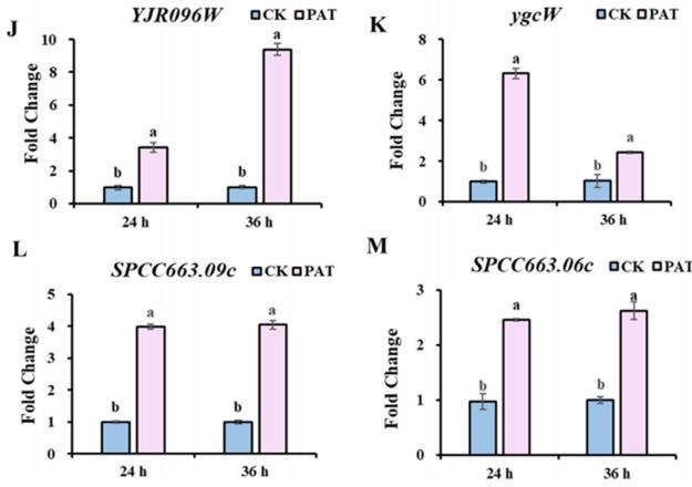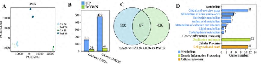 总共构建了12个文库。 图1A显示了这些文库的主成分分析(PCA),表明来自同一组的样本聚集在一起具有相似的PC1值,这解释了大部分变化(72%)。 如图1B所示,与对照组相比,处理组在24 h时有161个基因显著上调,26个基因显著下调。36 h时,处理组有479个基因显著上调,44个基因显著下调。 CK24与PAT24、CK36与PAT36之间共有87个共同基因(图1C)。KEGG注释分析这87个差异表达基因(deg)显示,它们富集于3类:代谢(7个亚类)、遗传信息处理(1个亚类)和细胞过程(1个亚类)。 氨基酸代谢、碳水化合物代谢、其他氨基酸代谢、复制和修复可能与M. guilliermondii的生长、应激反应调节和抗逆性有关(图1D)。 GO注释分析表明,这87个deg主要富集在3大类:生物过程(23个亚类)、分子功能(8个亚类)和细胞成分(16个亚类)。 细胞膜组分和细胞膜亚类可能参与了转运PAT的过程。 转运活性可能与膜的转运功能有关。 其抗胁迫活性可能与氧化活性和催化活性有关。 M. gillliermondii去除PAT可能涉及生物调控、信号传导、解毒和对刺激亚类的反应(图1E)。