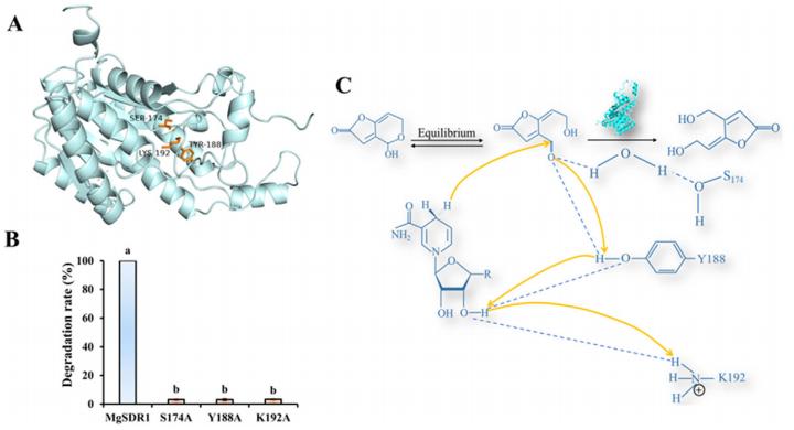 MgSDR1、MgSDR2和MgSDR3具有保守的催化三联体(图8A)。 通过位点诱变研究了关键催化三元组在MgSDR1降解PAT中的作用。 MgSDR1的活性位点(Ser174、Tyr188和Lys192)被Ala取代。 结果,突变蛋白(MgSDR1S174A、MgSDR1Y188A和MgSDR1K192A)的PAT降解率显著降低,活性几乎完全丧失(图8B)。 基于这些发现,作者提出了PAT降解的机制。 Tyr侧链作为催化碱,催化碱羟基的pKa可与NADPH的核糖羟基、带正电的赖氨酸和催化丝氨酸相互作用而降低。 此外,催化Ser的侧链可能与底物PAT相互作用,从而将其稳定在碱策略的结合口袋内的合理构象中。 催化产物反应开始于质子从Tyr的羟基转移到PAT的羰基氧原子。 随后,NADPH的氢原子被转移到羰基碳上,导致PAT的羰基转化为羟基(图8C)。