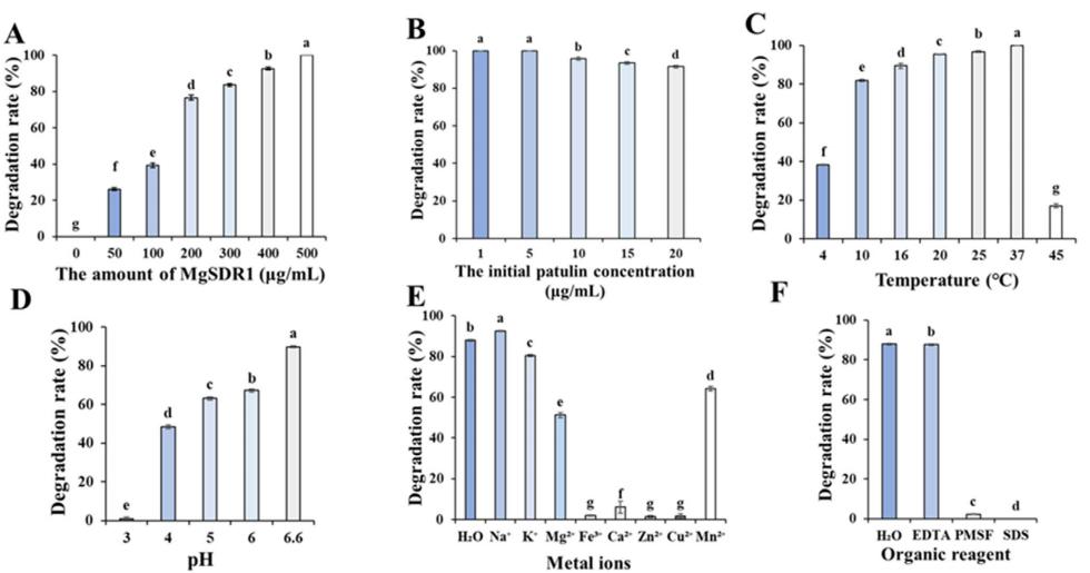 温度、pH、MgSDR1浓度和初始PAT浓度对生物降解过程影响较大。 图6A显示,MgSDR1浓度与PAT的降解率呈正相关。 当MgSDR1浓度为500 μgmL−1时,PAT的降解率为100%。 图6B显示,当初始浓度为1 - 5 μgmL−1时,PAT在相同的时间内完全降解。 而当PAT初始浓度为20 μgmL−1时,2 h内的降解率为91.44%。图6C显示,在25 ~ 37℃间,MgSDR1表现出最好的催化活性,完全降解率为100%。 图6D显示pH显著影响MgSDR1对PAT的降解速率。 其中,MgSDR1对PAT的降解率在pH 3.0时低于1%,在pH 4.0时达到48%,在pH 6.6时达到90%。