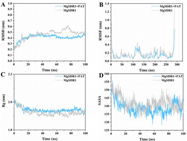 通过分子动力学模拟分析了MgSDR1-PAT配合物的构象变化和稳定性。 均方根偏差(RMSD)分析表明,MgSDR1-PAT复合物在前10ns经历了轻微的波动,主要归因于PAT结合,然后在模拟的其余部分实现稳定。 与单独的MgSDR1相比,MgSDR1PAT复合物显示出较低的RMSD,这表明MgSDR1和PAT之间存在很强的关联(图4A)。 总体而言,在100 ns模拟期间,MgSDR1- PAT复合物的均方根波动(RMSF)低于MgSDR1,这表明MgSDR1- PAT复合物表现出更大的稳定性(图4B)。 在整个模拟过程中,MgSDR1- PAT复合物和MgSDR1在溶剂可及表面积(SASA)上观察到轻微的变化。 这表明PAT结合可能在一定程度上影响MgSDR1的表面可及性,尽管总体影响很小(图4C)。 图4D显示,与MgSDR1相比,MgSDR1- PAT复合物的旋转半径(Rg)略有改变。 然而,MgSDR1-PAT复合物总体上表现出更低的Rg波动,这表明PAT结合对整体致密性的影响最小,在MgSDR1中,它可能有助于维持MgSDR1的稳定性。