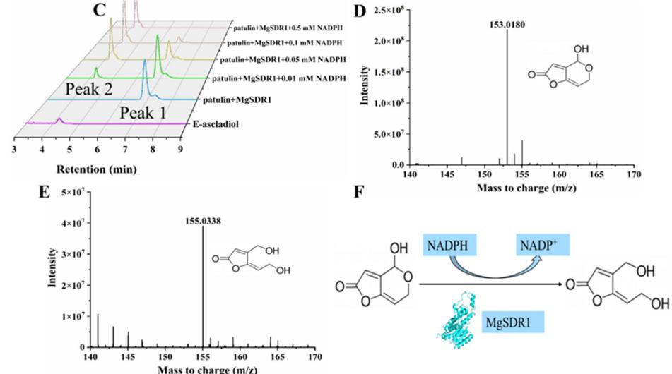 MgSDR1进行了额外的纯化以获得单个不同的目标带(图5A)。 NADPH是许多酶促反应的辅助因子。 当其浓度达到0.5 mM时,2 h时无法检测到PAT(图5B)。 此外,作者还对MgSDR1降解PAT的产物进行了分析。 高效液相色谱(HPLC)显示,PAT在6.9 min时达到峰值(峰1),在4.2 min时产生一个新的产物峰(峰2)(图5C)。 采用液相色谱-电喷雾-质谱法(LC-ESI/MS)鉴定了PAT及其降解产物的分子量。 在负离子模式下,PAT及其降解产物的分子量分别为153.0180和155.0338。 总体而言,MgSDR1将PAT转化为E-ascladiol表现出严格的还原烟酰胺腺嘌呤二核苷酸磷酸(NADPH)依赖性(图5D-F)。