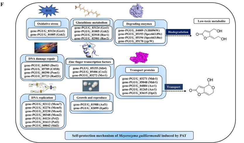 根据GO和KEGG数据库的注释信息,对deg进行进一步分类,鉴定出29个基因可能诱导PAT表达并进行自作者保护。 这些基因主要与氧化应激、谷胱甘肽(GSH)代谢、DNA损伤修复、DNA复制、生长繁殖、耐药和耐药、降解酶、锌指转录因子等相关。 这些基因的相关数据见图1F。