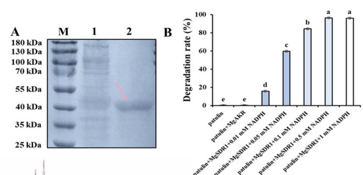 这些蛋白的表达中,带有n端6 × His-Tag的MgAKR、MgSDR1、MgSDR2和MgSDR3的分子量分别为≈38、40、36和35 kDa。原核表达结果表明,MgSDR1和MgAKR以可溶性形式表达,而MgSDR2和MgSDR3主要存在于包涵体中。在PAT上表达MgSDR1的大肠杆菌粗酶溶液优于不诱导蛋白表达的对照组的降解效果。