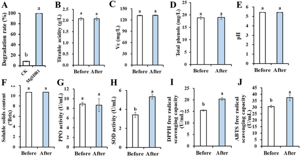 在鲜梨汁中验证了MgSDR1对PAT的降解作用。 新鲜梨汁中的PAT (10 μgmL−1)在12 h内被完全降解,降解率为100%(图7A)。 鉴于MgSDR1对鲜梨汁中PAT的降解效率较高,具有广阔的应用前景,作者对鲜梨汁的品质参数进行了测定。 生物降解过程对pH、多酚氧化酶(PPO)活性、可滴定酸度、维生素C (Vc)、可溶性固形物和总酚含量无显著影响(图7B-G)。 生物降解后,果汁超氧化物歧化酶(SOD)活性、2,2-二苯基-1-苦酰肼(DPPH)活性和2,2 '氮基-双-(3-乙基苯并噻唑啉-6-磺酸(ABTS)自由基清除能力显著提高。 上述结果表明,生物降解过程可以提高抗氧化能力(图7H-J)。 新鲜的梨汁呈黄褐色。 生物降解前后样品的颜色参数(L、a、b)、总色差(ΔE)、浊度、褐变指数保持一致。 这表明PAT降解过程没有改变新鲜梨汁的颜色、浑浊度或褐变程度。
