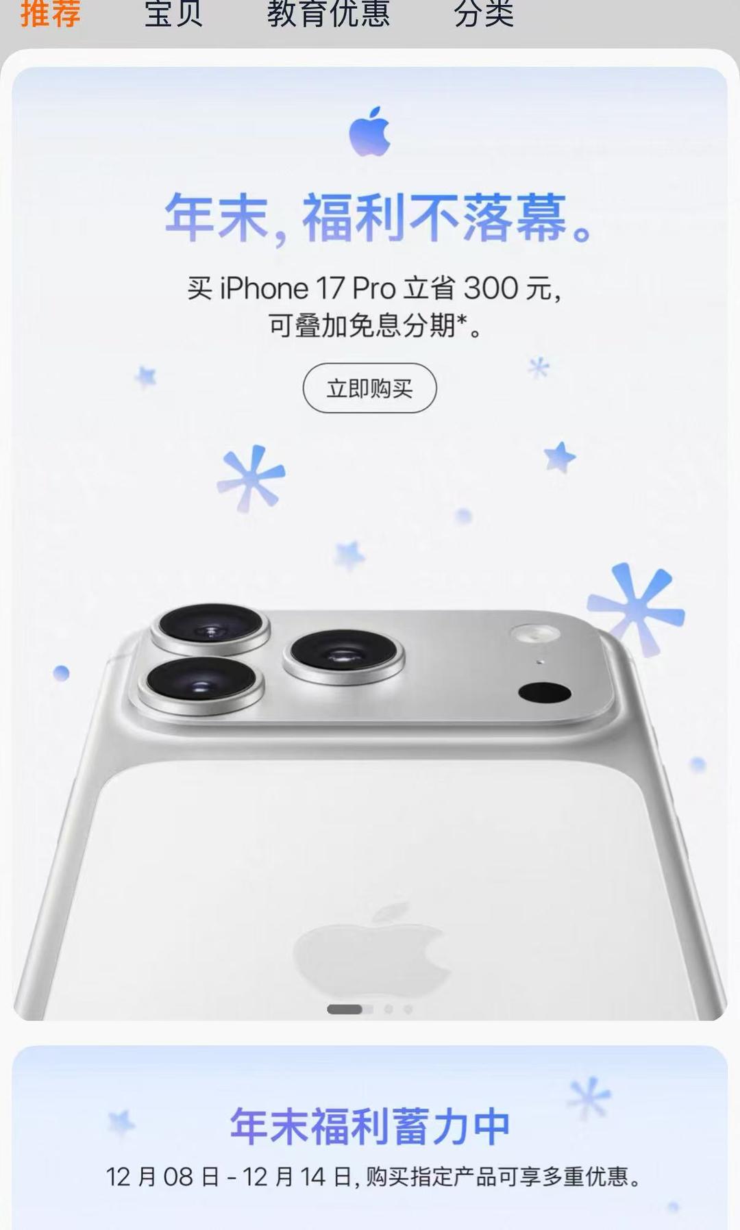 苹果电商旗舰店推出年末降价活动,iPhone17Pro及iPhone17ProMax机型降价300元