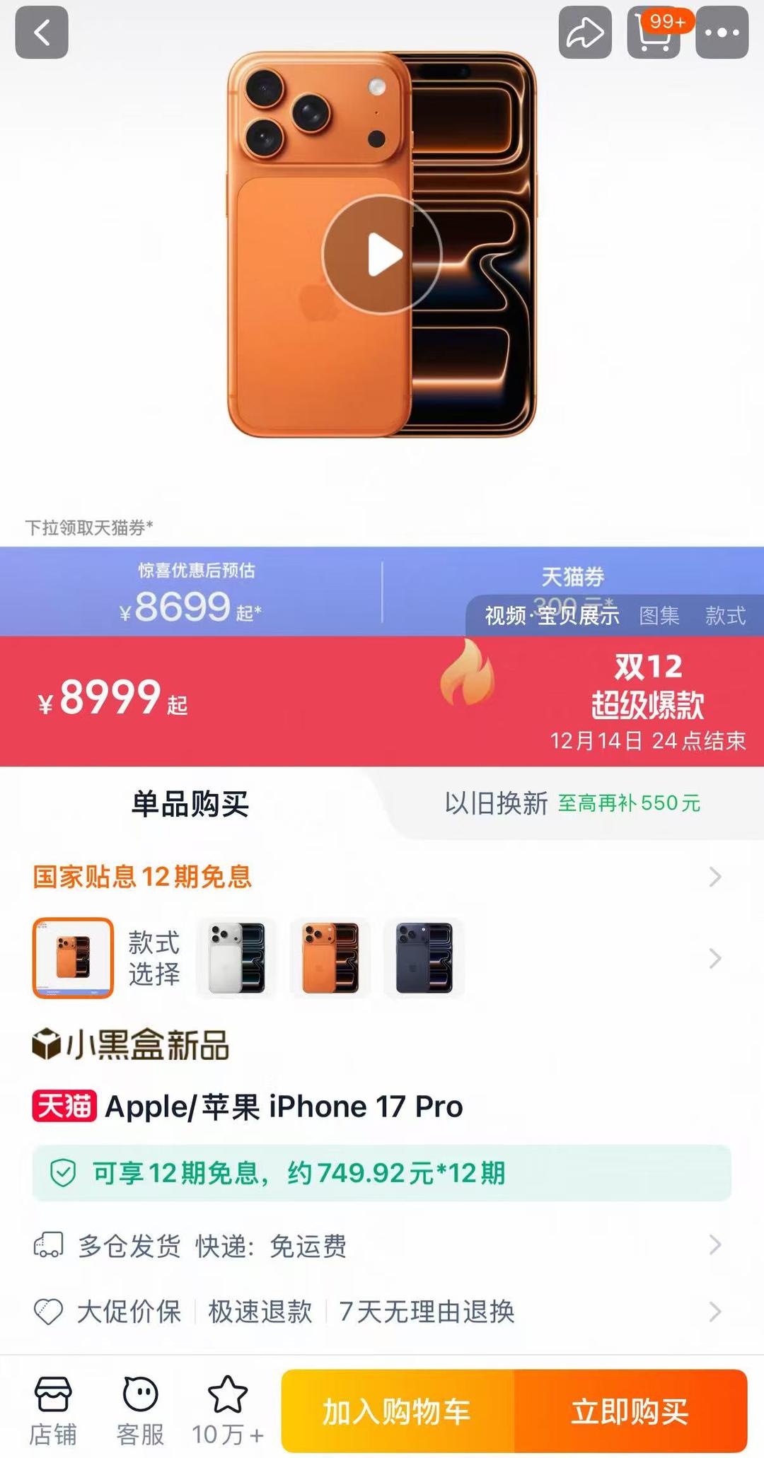 12月8日,苹果官方在电商旗舰店推出年末降价活动,iPhone 17 Pro及iPhone 17 Pro Max机型降价300元,降价后iPhone 17 Pro售价8699元起,iPhone 17 Pro Max售价9699元起。部分地区可享国家补贴至高可省500元。