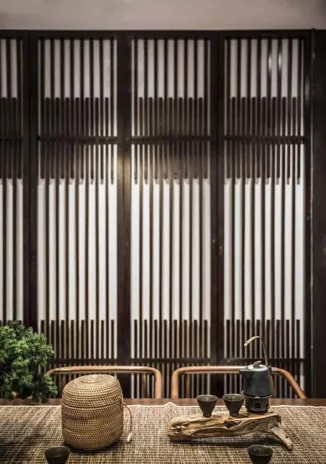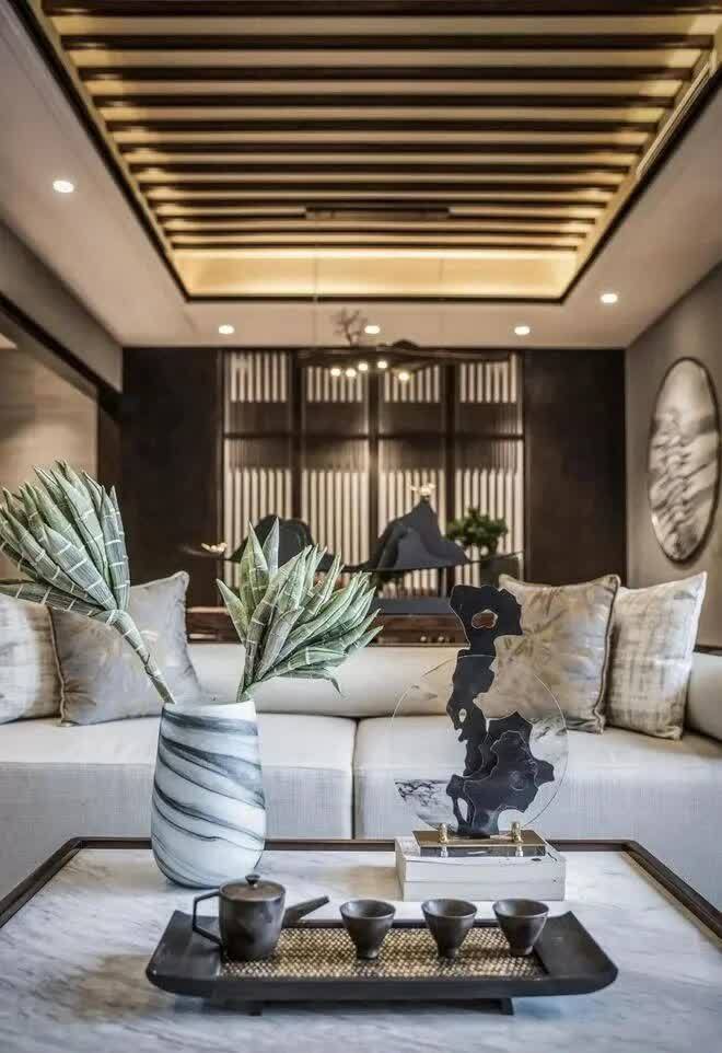 因此在客厅设计上,设计师不再堆积华丽,而是顺其自然,在恰当的地方,点缀恰当的中式元素,一壶茶,一青瓷,皆是美不胜收。
