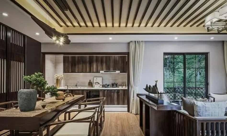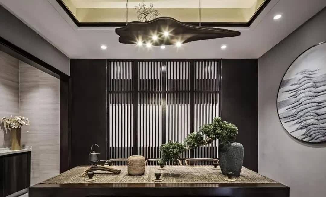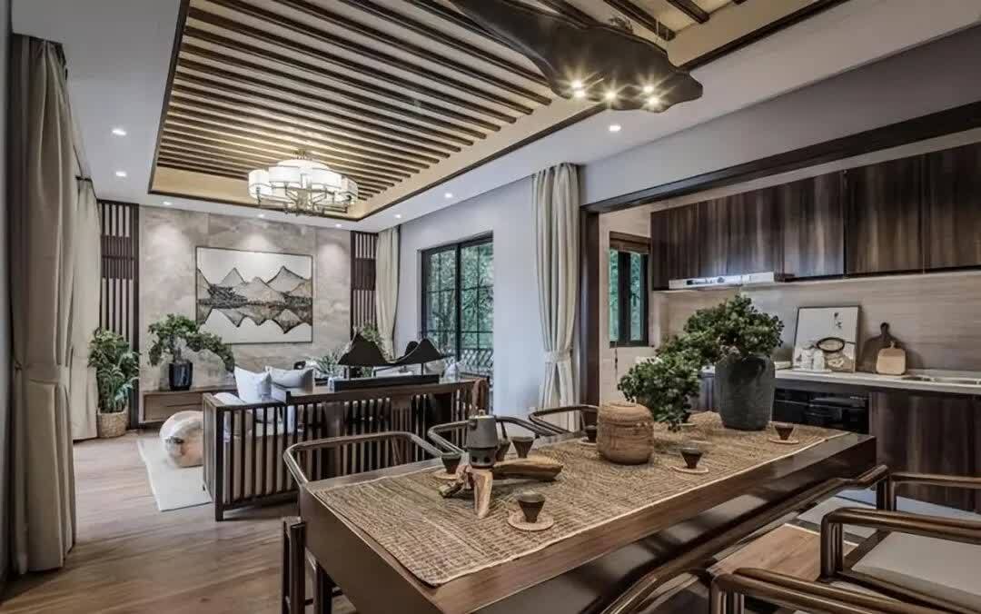 餐厅是开放式的,让人感觉更亲近和温馨。餐桌和椅子是传统的中式风格,与圆形的水墨画相呼应,展现了东方的美学。