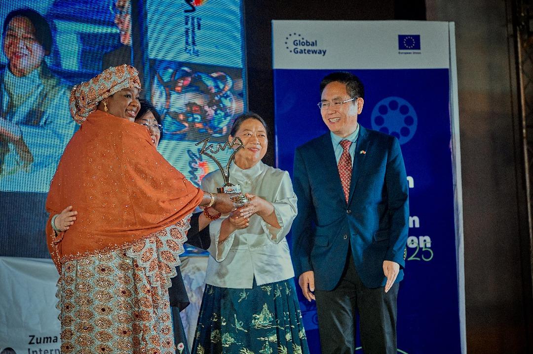 尼日利亚联邦首都区部国务部长玛利亚·马哈茂德(左)为柴红芳(中)颁奖。尼日利亚中国文化中心供图