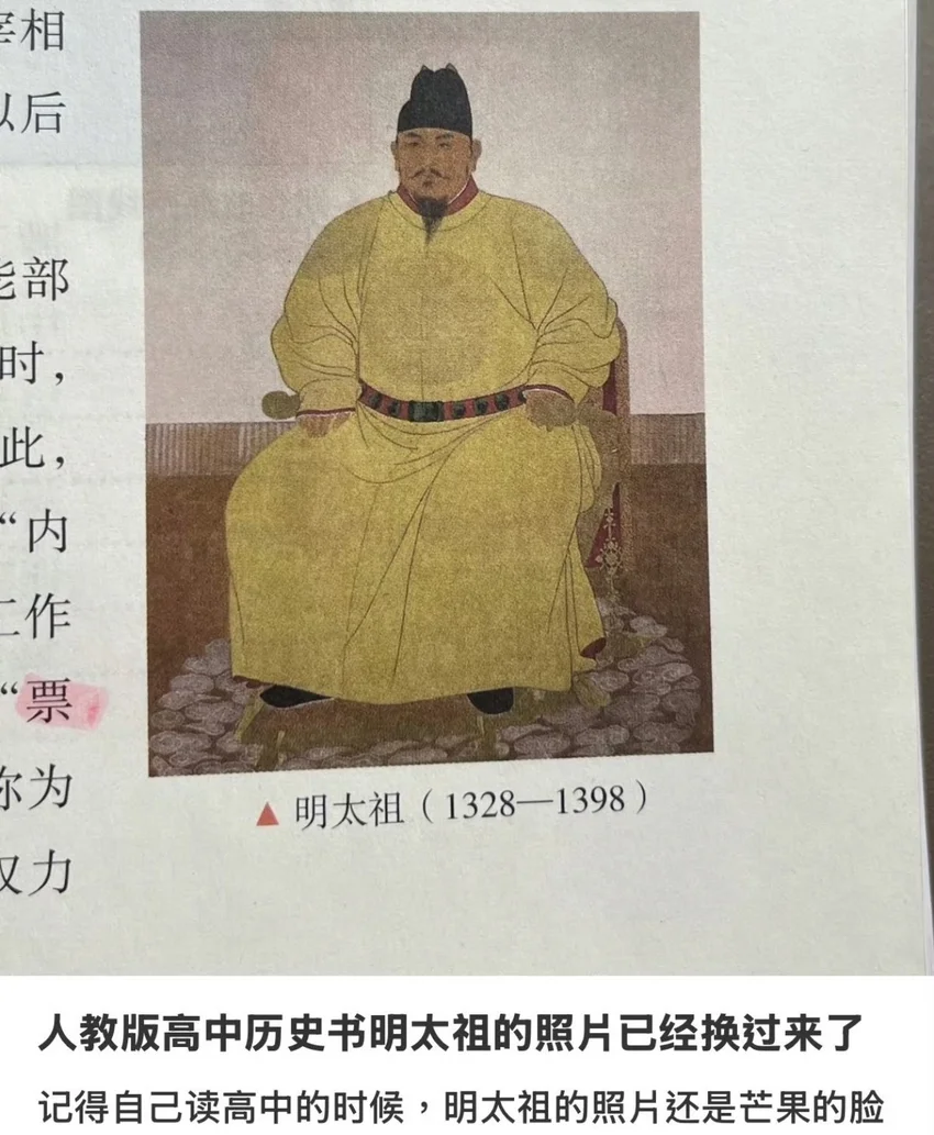 2025年12月7日,“课本上明太祖照片更换”话题登上热搜榜首。新版初中历史教材中将朱元璋以往民间流传的“鞋拔子脸”画像,更换为更加标准的肖像。新像呈现朱元璋面容方正、身着龙袍的庄严形象。