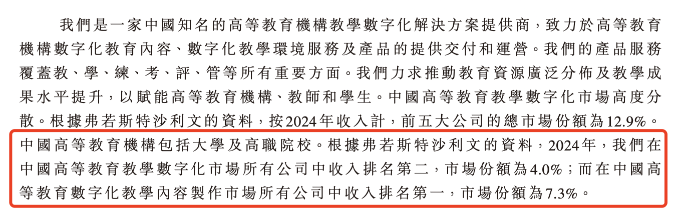 根据弗若斯特沙利文的资料,2024年,公司在中国高等教育教学数字化市场所有公司中收入排名第二,市场份额为4.0%;而在中国高等教育数字化教学内容制作市场所有公司中收入排名第一,市场份额为7.3%。