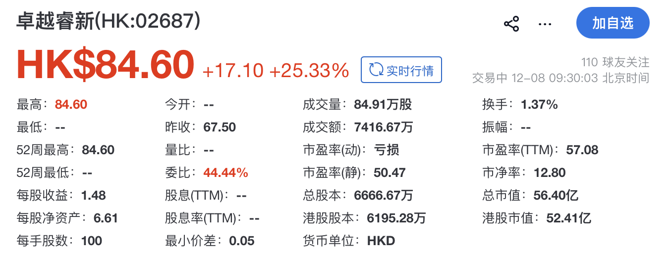 瑞财经 吴文婷 12月8日,卓越睿新(02687.HK)在港交所挂牌上市,农银国际为其独家保荐人。其开盘报84.6港元,涨25.33%,总市值约56.4亿港元。