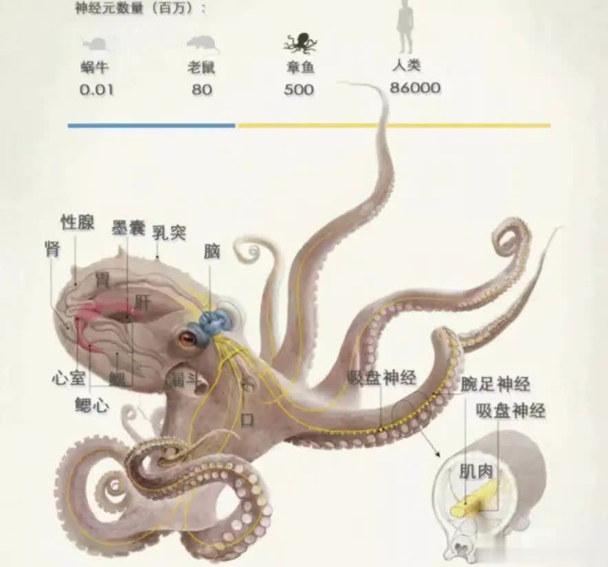 此外,章鱼有八条腕足,每条腕足都具备一个独立的神经中枢,再加上头部的主脑,相当于一只章鱼拥有9个大脑!这也为章鱼的智慧提供了先天优势,使得章鱼成为无脊椎动物中智商最高的物种。