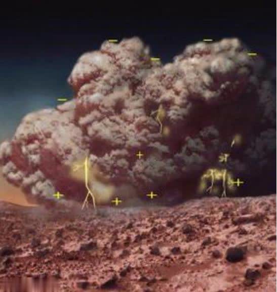 或许是由于闪电的作用。2006年,尽管有些科学家宣称火星上没有闪电,但地球上的微波探测器却在激烈摩擦的红色尘土中找到了它,那种闪电和我们熟悉的那种雷雨中的闪电不一样,因为火星上不下雨,那是一种干闪电,或者说是静电,而正是那些静电可能让火星上有了生命。因为有了闪电,就有了新能源可以影响化学反应,一定程度上会让空气中火星表面上的物质发生变化。