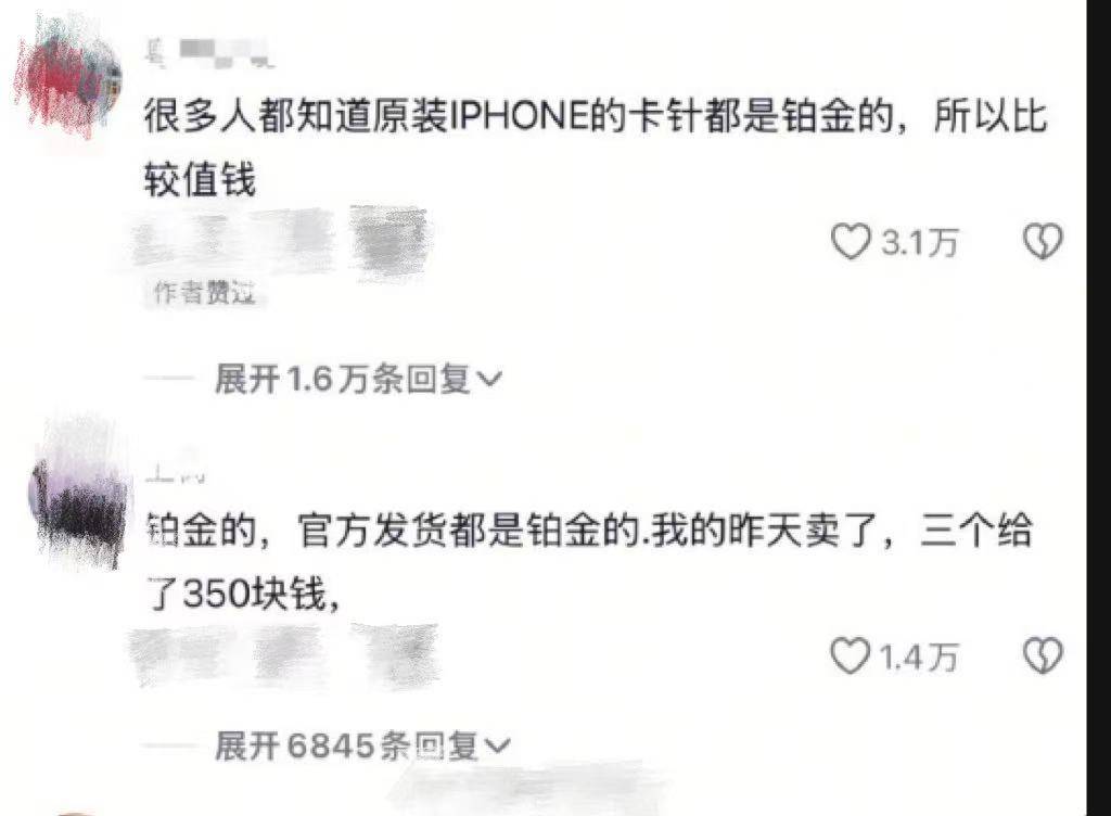 苹果原装取卡针铂金材质回收价超300元? 官方售后:非铂金制成