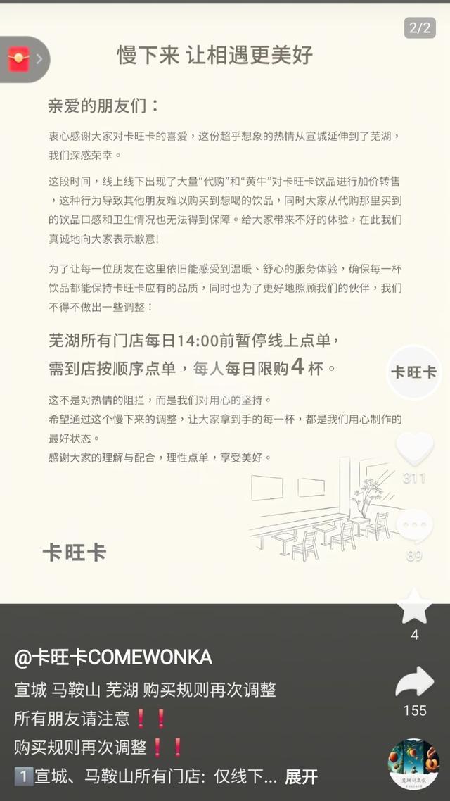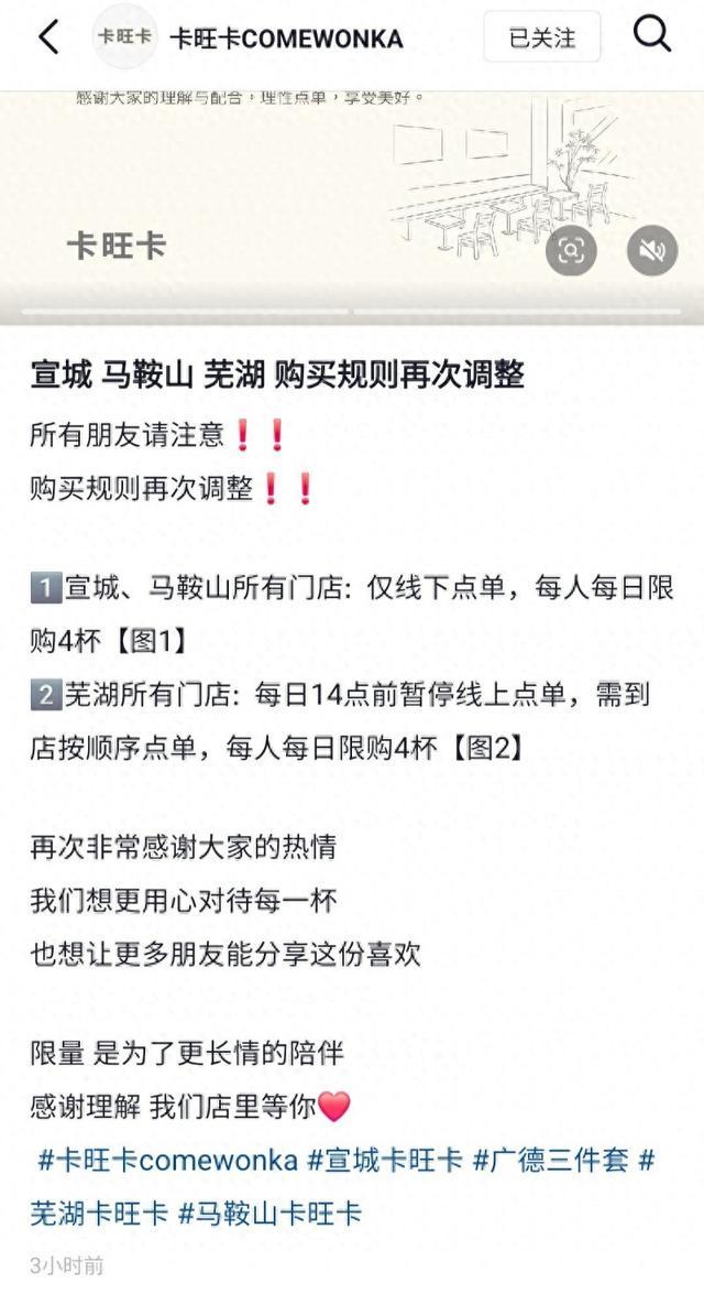 12月8日上午,卡旺卡在社交平台发布“宣城、马鞍山、芜湖购买规则再次调整”的信息,其中表示,宣城、马鞍山所有门店仅线下点单,每人每日限购4杯;芜湖所有门店每日14点前暂停线上点单,需到店按顺序点单,每人每日限购4杯。