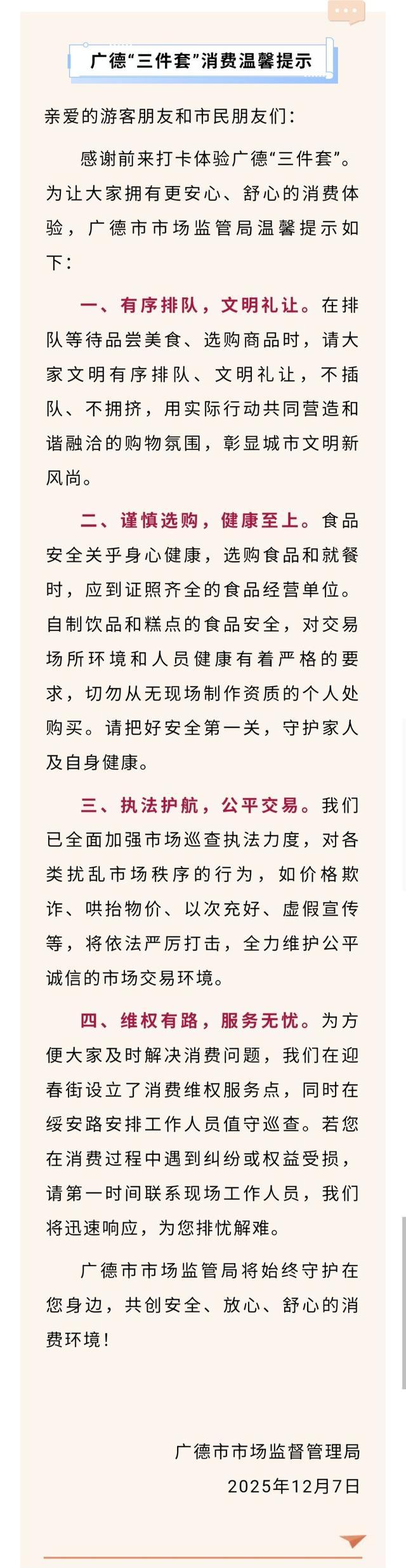 广德市市场监督管理局表示,他们已全面加强市场巡查执法力度,对各类扰乱市场秩序的行为,如价格欺诈、哄抬物价、以次充好、虚假宣传等,将依法严厉打击,全力维护公平诚信的市场交易环境。同时,为方便大家及时解决消费问题,广德市市场监督管理局在迎春街设立了消费维权服务点,同时在绥安路安排工作人员值守巡查。若游客和市民在消费过程中遇到纠纷或权益受损,可第一时间联系现场工作人员,他们将迅速响应,排忧解难。