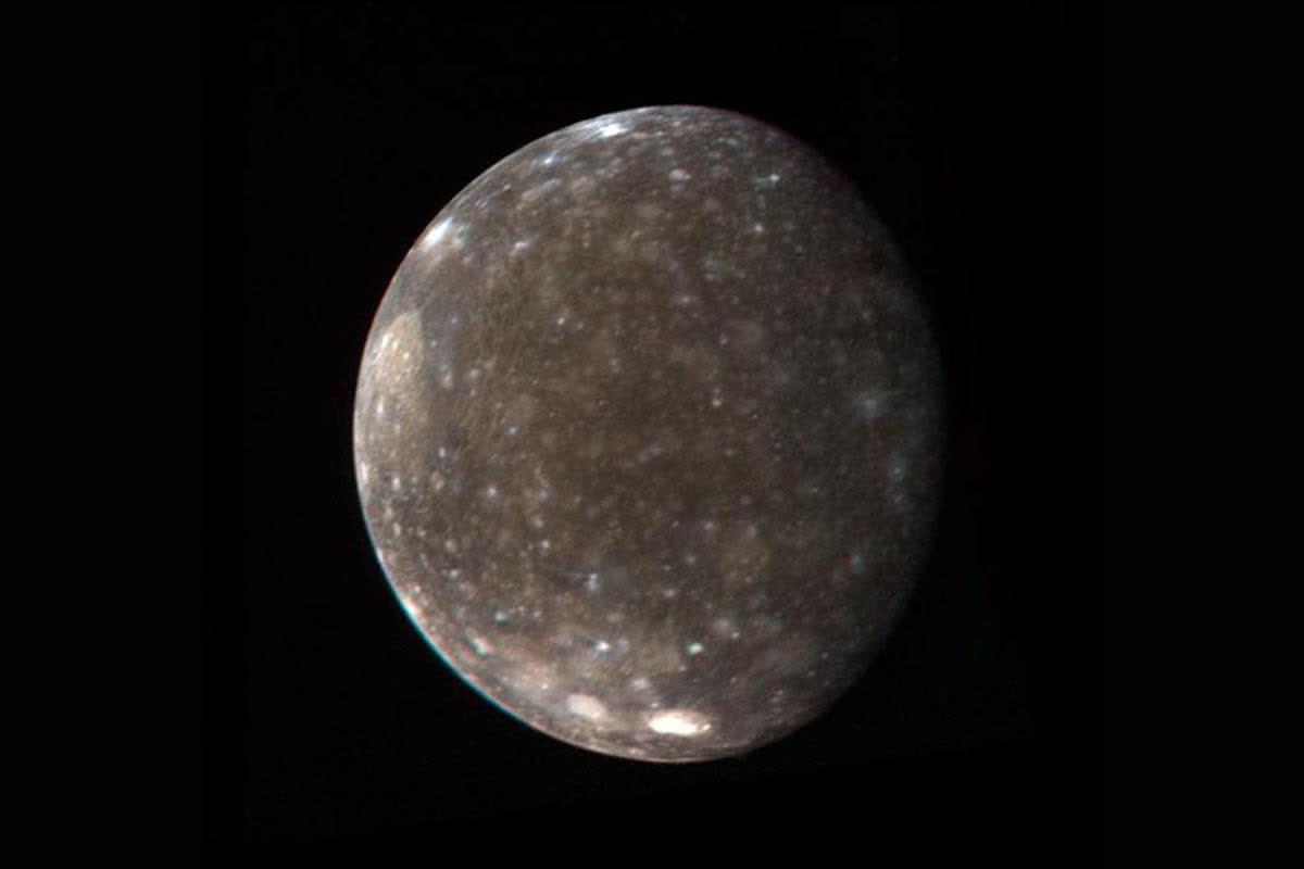 1979 年 3 月 5 日,美国宇航局航行者 1 号航天器从 120 万公里外拍摄到木卫四的彩色图像。撞击结构和纯水冰的白色区域清晰可见