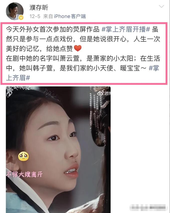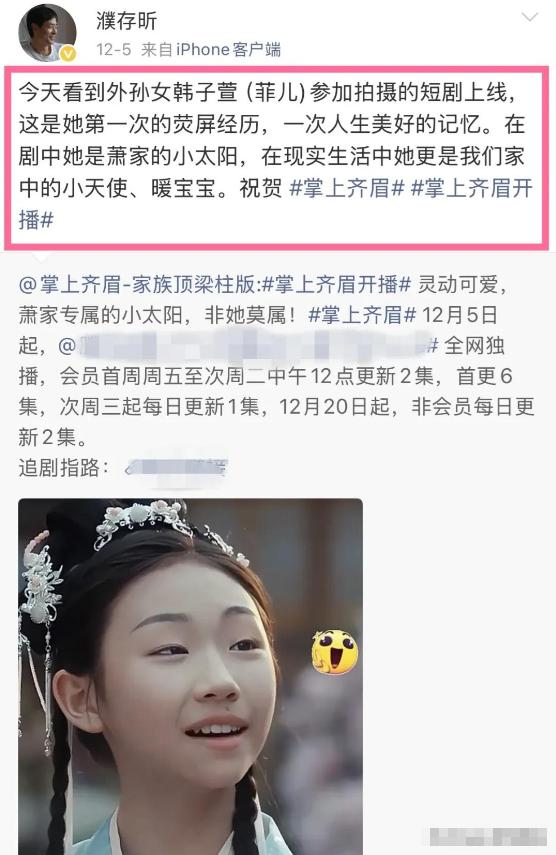 濮存昕发布的三条动态本身内容很简单,就是介绍外孙女韩子萱参演了一部叫《掌上齐眉》的短剧,配了几张剧照和花絮照片。
