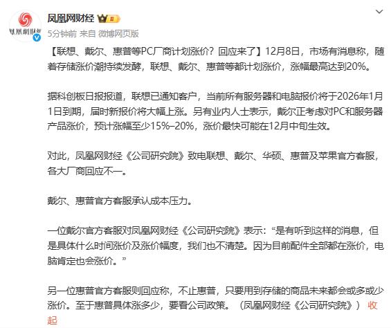 【CNMO科技消息】12月8日,凤凰网财经《公司研究院》致电联想、戴尔、华硕、惠普及苹果官方客服对公司产品计划涨价一事进行询问,各大厂商回应不一。戴尔、惠普官方客服承认成本压力。一位戴尔官方客服对该媒体表示:“是有听到这样的消息,但是具体什么时间涨价及涨价幅度,我们也不清楚。因为目前配件全部都在涨价,电脑肯定也会涨价。”另一位惠普官方客服则回应称,不止惠普,只要用到存储的商品未来都会或多或少涨价。至于惠普具体涨多少,要看公司政策。