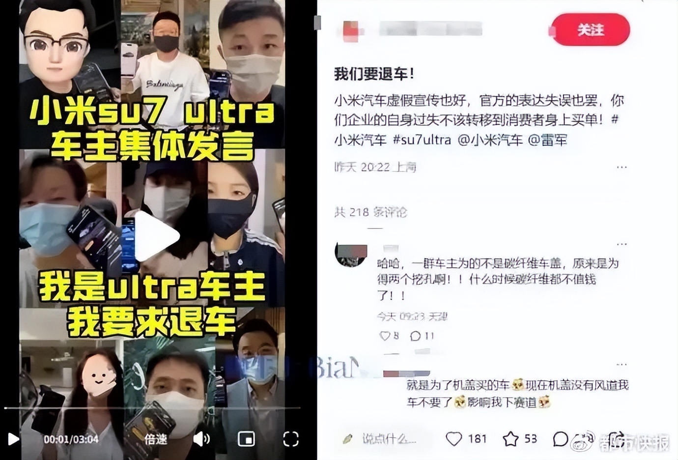 而且这不是小米第一次沾染上类似不信任危机,之前小米SU7 Ultra的碳纤维双风道前舱盖被车主质疑宣传和实际不符,车主们要求退车或者全额退还两万元定金。