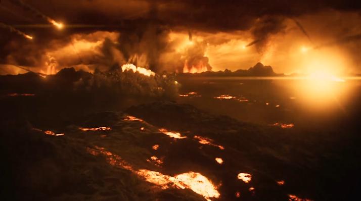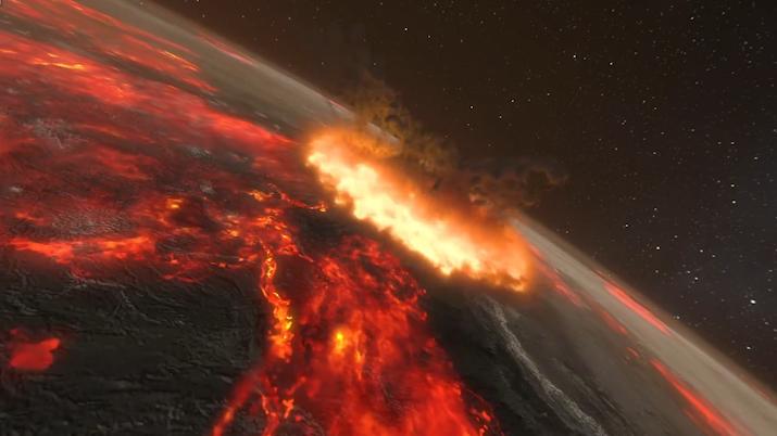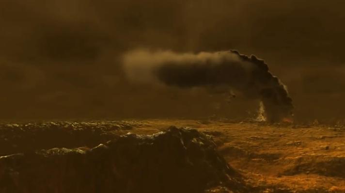 你现在看到的是地球历史中最黑暗、最恐怖的时期——冥古宙。这是一个比地狱还要严酷的时代,那时的地球既没有我们熟悉的蓝天,也没有温暖的阳光,更没有一块可以落脚的土地。取而代之的是一片无边无际、炽热
