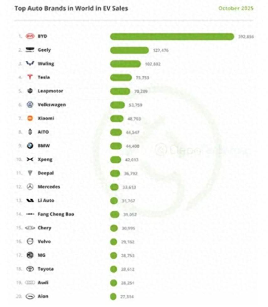 2025年10月全球汽车销量榜单的出炉,让整个行业为之震动:特斯拉虽仍握着全球第一的市值(近一万五千亿美元),但实际销量却滑落至第四位,仅卖出七万多台;而榜单前三甲被比亚迪、吉利、五菱三大中国品牌包揽