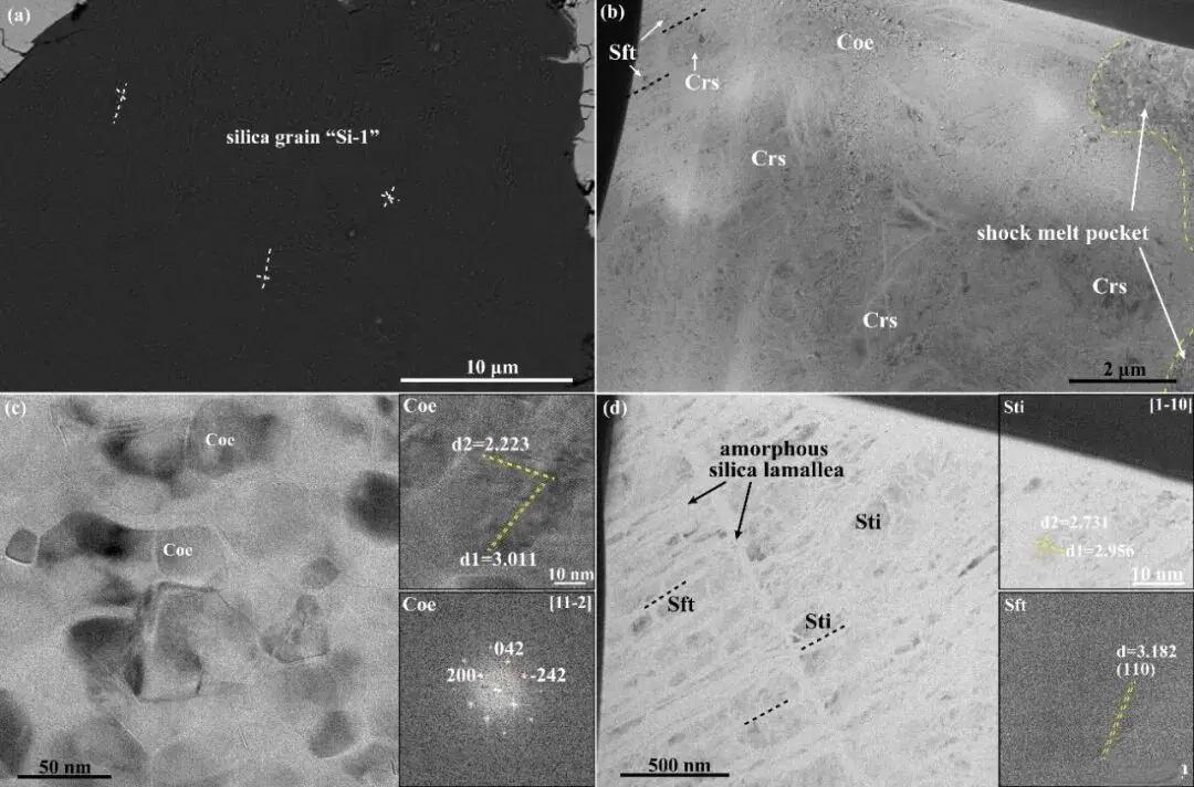 研究团队在嫦娥六号低钛玄武岩中发现丰富的冲击变质特征,包括含高压矿物相赛石英—斯石英—柯石英的二氧化硅颗粒、熔长石、冲击熔融囊内的斯石英和沿贯穿熔融囊裂隙边界生长的定向石英簇,以及辉石的成分振荡环带等。