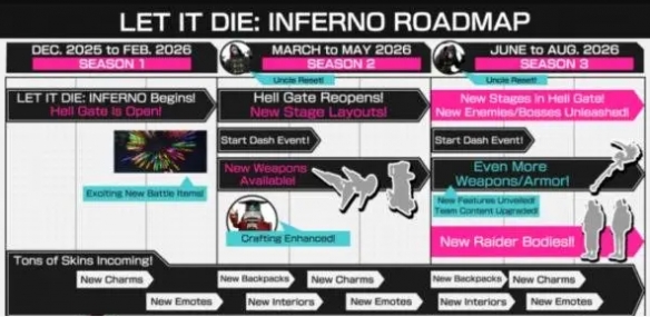 《LET IT DIE》系列新作《LET IT DIE: INFERNO》正式推出。与此同时,发行商GungHo Online Entertainment与开发商Supertrick Games公布了游戏的长期更新路线图,详细说明了近期优化与未来赛季的更新方向,展现了团队对游戏长期运营的承诺。