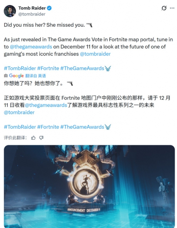 《古墓丽影》官方推特于近日正式确认,系列全新作品将在12月12日北京时间上午8:30开启的TGA 2025颁奖礼上正式公布。官方以一句充满情怀的“你想她了吗?她也想你了。”作为开场,并指引粉丝通过《堡垒之夜》内的互动地图门户所揭示的信息,在12月11日(美国时间)锁定TGA直播,以了解这个“游戏界最具标志性系列之一的未来”。