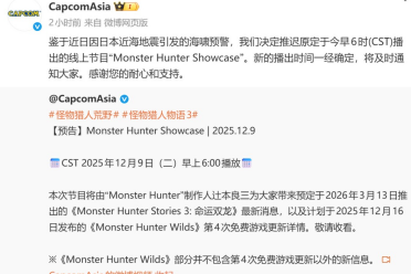 Capcom原定于北京时间今日早6点举行的《怪物猎人》特别直播活动,将由系列核心制作人辻本良三(被粉丝亲切称为“三太子”)亲自主持。直播计划带来两大重点内容:一是正式揭晓《怪物猎人物语3:命运双龙》的最新情报;二是详细介绍《怪物猎人:荒野》即将发布的第4次大型免费游戏更新详情。然而,CapcomAsia官方微博于今早发布公告,受近期日本近海地震及引发的海啸预警影响,原定于今早6时(CST)播出的线上节目“Monster Hunter Showcase”确认延期。
