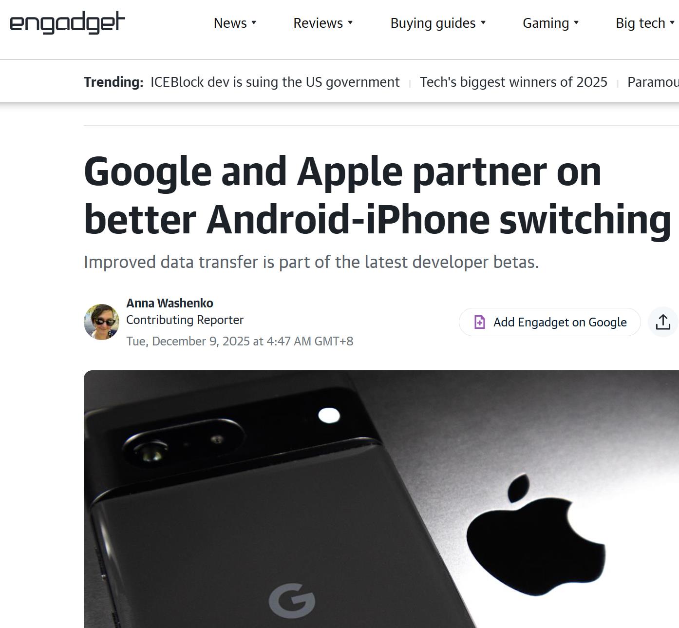 【环球网科技综合报道】12月9日消息,据engadget报道称,长期各自为营的谷歌与苹果正展开罕见合作,共同开发一项旨在显著改善用户在安卓与iOS设备之间切换体验的新功能。这一协作成果已初步体现在最新发布的Android Canary开发者测试版中,并预计将在即将推出的iOS 26开发者版本中同步亮相。