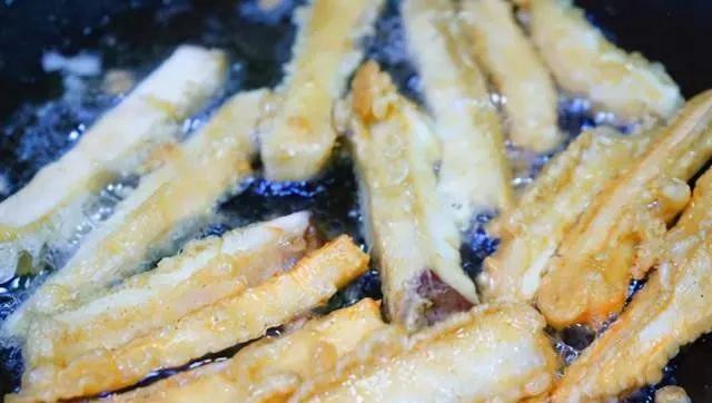 3、炸杏鲍菇油温要掌握好,太低易吸油,油温太高容易炸糊,一般掌握在6成热最宜,可以滴入一滴蛋糊,如果可以快速浮起说明油温正合适,杏鲍菇最后再复炸一遍是为了口感更加酥脆,复炸要快,大火5秒便可。