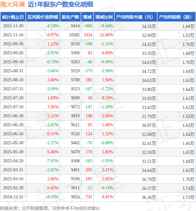 从股价来看,2025年11月10日至2025年11月30日,南大环境区间跌幅为4.74%,在此期间股东户数减少868.0户,减幅为8.44%。