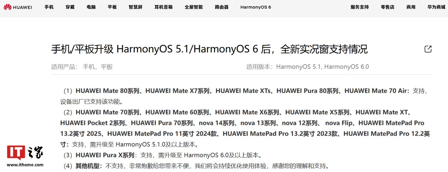 IT之家注意到,华为官网现对鸿蒙 HarmonyOS 5 / 6 系统的实况窗支持应用和场景进行了更新,新增支持淘宝闪购、网易云音乐等 App。