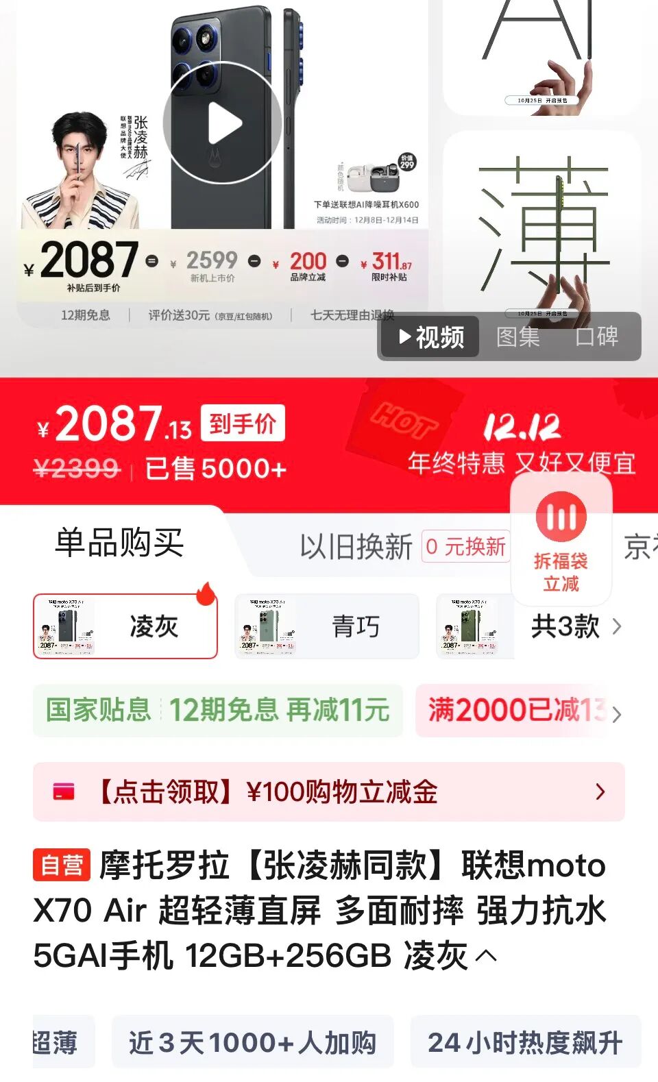 至于同样在售的联想moto X70 Air,厚度方面逼近苹果,仅5.9毫米,由于使用了塑料机身,重量不足160克,电池也有4800毫安时。更重要的是,这款轻薄智能机官方售价仅2599 元,叠加平台优惠及补贴只要2000元上下,价位上颇接地气。