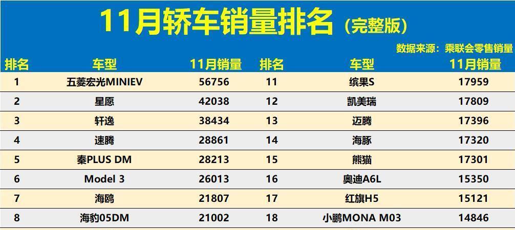 进入年底冲刺的11月,轿车市场呈现出与SUV不同的竞争态势。五菱宏光MINIEV以超过5.6万辆的销量强势登顶,重新证明了微型电动车在特定市场的强劲需求。吉利星愿和日产轩逸紧随其后,分别站上4.2万和3.8万辆台阶,共同
