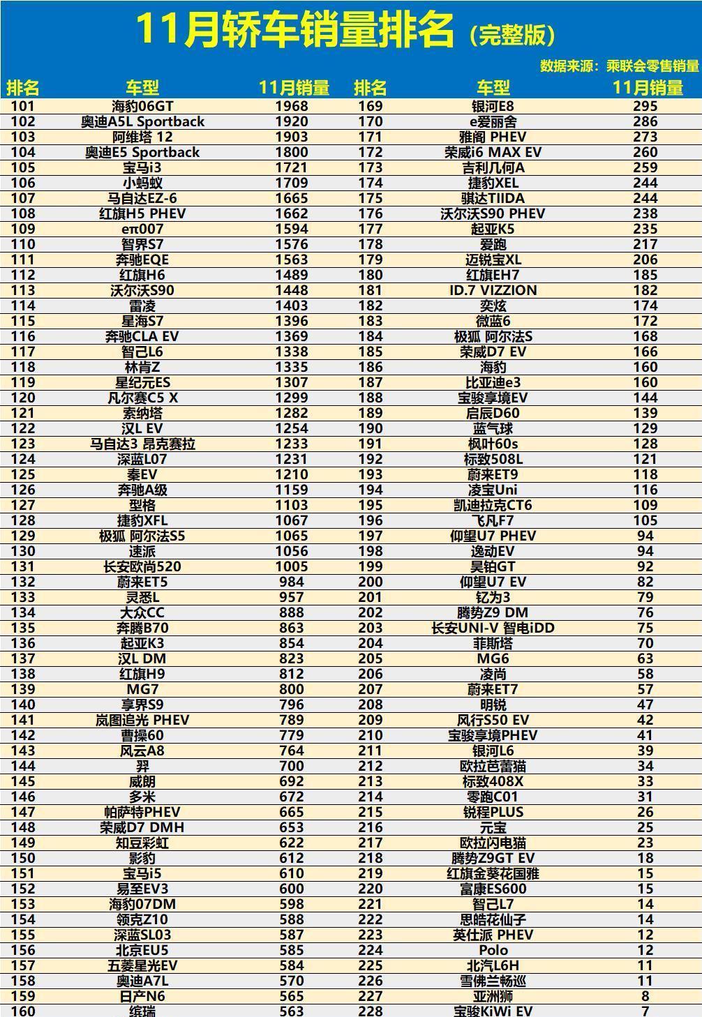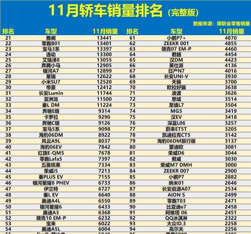 在排名第11至第100名的广阔中游地带,堪称市场最激烈的“绞肉机”。凯美瑞、迈腾等传统B级车霸主,月销量在1.7万辆左右,正努力守住市场份额。宝马3系、奔驰C级等豪华品牌车型,月销约9000至1.3万辆,在品牌光环下进行着份额争夺。这个区间更是新能源车型的聚集地:零跑B01、银河A7、小米SU7等新势力产品表现活跃;比亚迪的秦L、海豹06系列多款车型分散布局;传统品牌的电动化作品如红旗E-QM5也在其中。同时,帝豪、逸动、艾瑞泽8等国产燃油家轿凭借性价比苦苦支撑。这一区域的车型数量庞大,但销量差距微小,任何一款车型在配置、价格或营销上的细微失误,都可能导致排名大幅滑落。