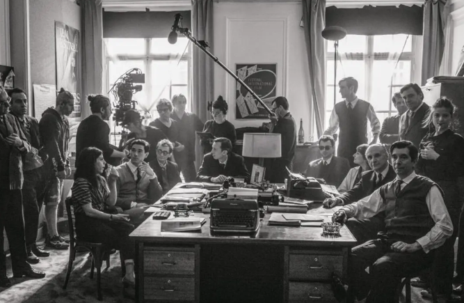 极具讽刺意味的是,这部歌颂模拟时代粗糙美学的作品,其底层逻辑却是高度数字化,高度精致的。林克莱特承认,尽管部分镜头使用了柯达5222黑白底片,但大部分画面是数字拍摄,再通过后期特效模拟胶片颗粒、划痕,甚至人工添加每20分钟一次的换卷提示点。